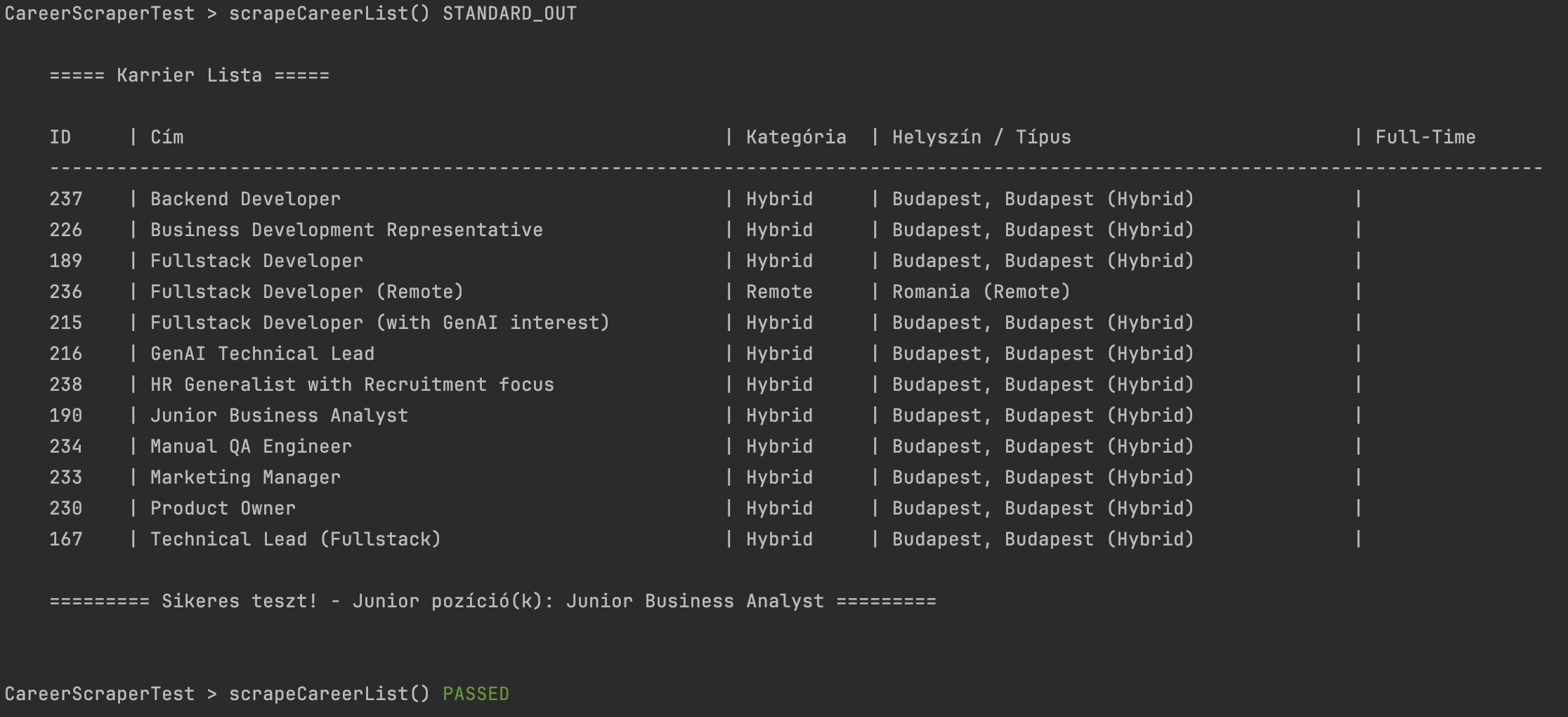 A clean test parancs lefordítja a kódot, majd elindítja a CareerScraperTest, amely: